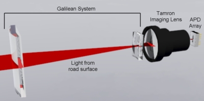The telescopic lens system is mounted in front of the imaging lens system. It is designed to restrict the field-of-view of the imaging lens along the width of the laser line, but not alter the field-of-view along the length of the line. Because the laser line is much longer than it is wide, use of the imaging lens alone would result in a much wider strip of pavement being visible to the sensor than is desired. The telescopic lens system is used to match the dimensions of the laser line image with those of the sensor array.