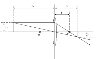 Figure 1, above, shows standard lens parameters used in the following calculations. Based on the assumptions that the lane width (ho) is around 3.05 m (10.0 ft), the unit will be mounted about 6.40 m (21.0 ft) above the roadway ,and the sensor is 7.5 mm (0.295 in) long , an image distance was calculated for the sensor using Equation 1. It was determined that = 15.8 mm (0.620 in).